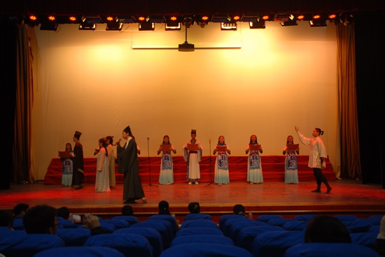 下午两点三十比赛正式开始。本次共有二十二支队伍参赛,每队都各有特色,选手们激情澎湃。一个小时后,经济管理学院作为第十四支参赛队伍出场,朗诵的诗歌题目是《我骄傲,我是中国人》。在主持人的介绍下,经济管理学院的选手们有序登场,他们充满热情的舞蹈,声情并茂的歌曲,铿锵有力的朗诵,充沛饱满的感情,自信大方的形象赢得了老师同学们热烈的掌声。本次青春诗会,节目精彩纷呈,同学们激情飞扬,充分展现了潍坊学院学生积极自信的一面。通过举办经典诵读比赛,让广大青年学生从中国历代名家名篇中提炼思想精华和道德精髓,赋予时代新内涵,树立正确的世界观、人生观、价值观、荣辱观,真正使中华优秀传统文化成为涵养社会主义核心价值观的重要源泉。