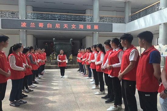 早上,伴着徐徐清风,服务队的队员们来到了博物馆。首先,大家在馆口集合,负责人强调纪律,特别是秩序问题。然后,队员们在博物馆讲解员的带领下进到博物馆内学习参观。在讲解过程中,队员们严格遵守纪律,认真的听讲解员的讲解,没有一个人插科打诨,遇到不懂得地方也虚心请教,讲解员也非常有耐心,尽心尽力的解释他们的疑惑。在讲解员的悉心讲解下,队员们基本掌握了博物馆的讲解内容。之后,服务队队员们试着实践讲解,博物馆讲解员听了表示很好。最后,大家在波兰哥白尼天文海报展馆前拍照留念。他们都说这是一次非常有意义的活动,也表示如果以后有机会,他们会积极参与到博物馆讲解员的志愿活动中。