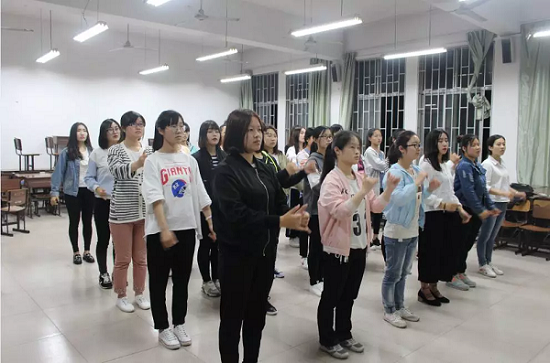 本次手语教学是通过视频教学。他们一遍又一遍模仿视频中老师的动作,认真地学习。在这次活动中,各个手语参赛人员都积极跟随视频学习手语的基本动作,虽然这些基本动作虽然数量不多,但是连贯的做下来还是比较有难度的,所有参于手语比赛的同学们都十分认真的学习,从一开始现场学习氛围就变得十分热烈。看的出同学们都是第一次接触手语学习,有许多动作还是做的不好,她们互相给对方挑错误,指不足,然后再虚心改正。在最后一次合练的时候,信控学院的女孩儿们因为几天的相处变得动作十分一致,这让大家感到特别的开心,并在接下来的训练中更加用心。