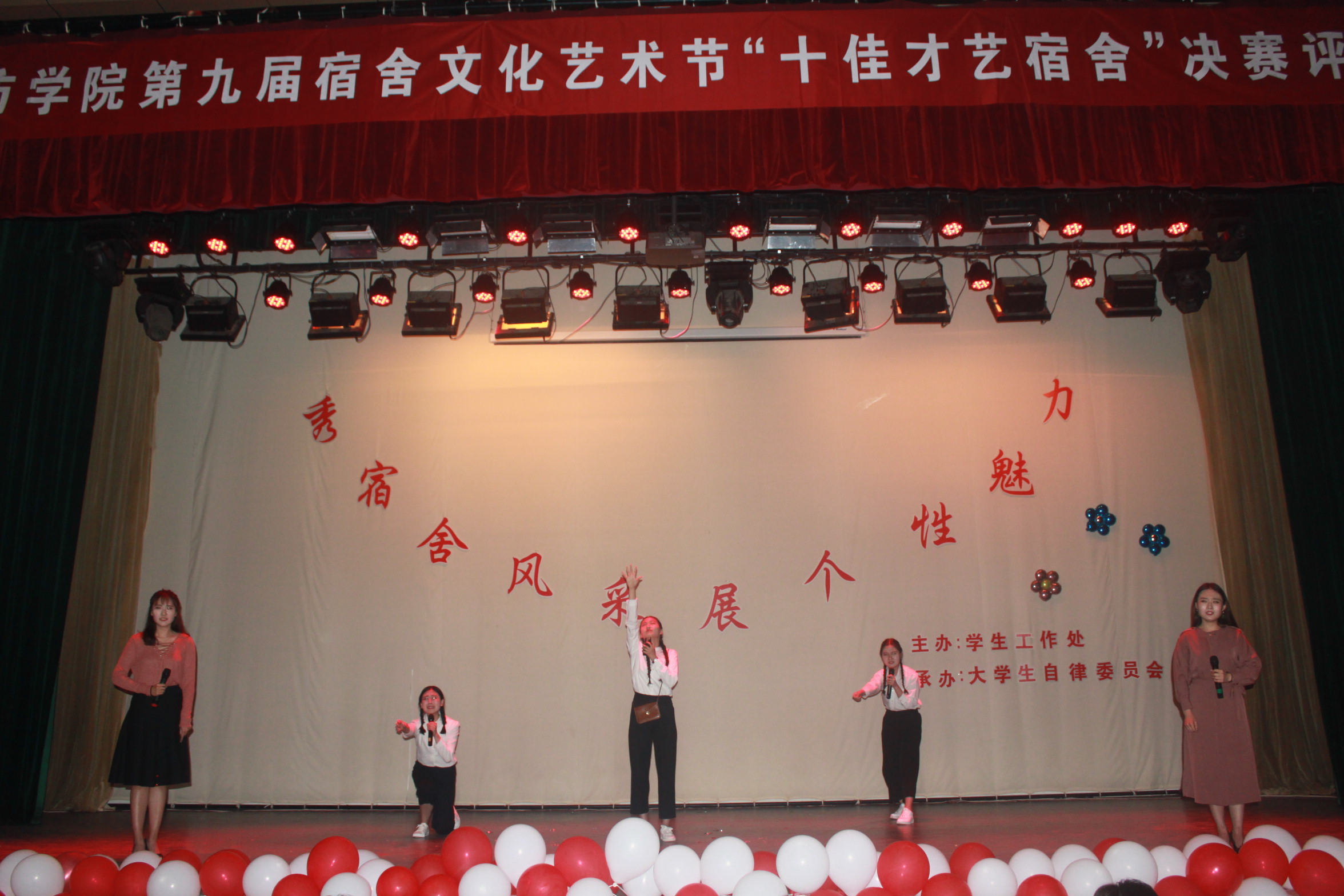 为充实同学们的生活,给学生一个施展才华的舞台,由学生工作处主办、大学生自律委员会承办的潍坊学院第九届宿舍文化艺术节“十佳才艺宿舍”决赛评选于5月10日晚在图书馆报告厅举办。潍坊学院学工处副处长张付功出席本次活动。潍坊学院公寓管理中心副主任陈志银,潍坊学院辅导员姜荣鑫,潍坊学院大学生自律委员会主席王一鸣,潍坊学院大学生自律委员会副主席安勇,潍坊学院大学生自律委员会副主席王玉莹,潍坊学院大学生合唱团团长张国庆,潍院好声音前三强李梦瑶担任本次比赛评委。传媒学院播音与主持艺术专业6414、6419宿舍参加了比赛评选。