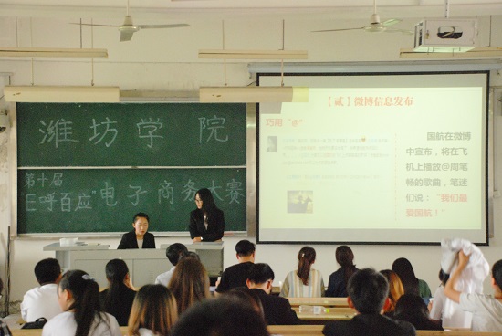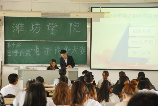 为深入贯彻习近平总书记的重要讲话精神和全国高校思想政治工作会议精神,大力弘扬传统文化。为积极响应潍坊学院团委的号召,2017年5月11日下午3点,经济管理学院于致远楼512教室举行了电子商务大赛初赛,本次大赛由校团委主办,经济管理学院团总支、学生分会承办。参加中国互联网协会第九届全国大学生网络商务创新应用大赛并荣获特等奖的乔磊、洪韦、郭银铃、吴静静作为本次比赛的评委。