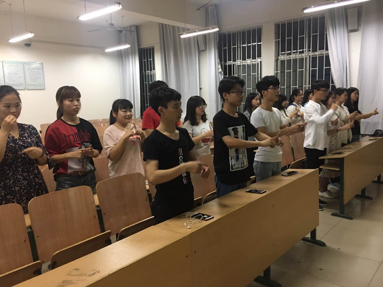 本次手语比赛传媒学院代表队将派出22名学生参加,其中20人参与手语表演,1人歌词演唱,另外1人伴舞。本次比赛选取了由beyond原唱、邓紫棋翻唱的《喜欢你》作为比赛的曲目。这是一首关于爱的忏悔之歌,虽结构简洁但却十分耐听。同学们一边听着歌词,一边记手语动作,所有人全神贯注,认真的对待本次手语比赛。