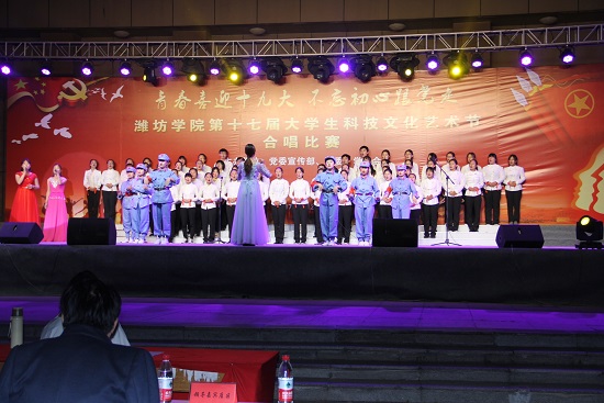 为团结引领广大青年听党话、跟党走,以奋发向上的精神状态迎接党的十九大,2017年5月25日晚七点,行政楼后广场举办以“青春喜迎十九大,不忘初心跟党走”为主题的潍坊学院第十七届大学生科技文化艺术节合唱比赛,马克思主义学院参赛队积极参加了此次合唱比赛。