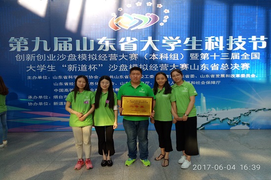 为了更好的展现大学生的风采,提高大学生的创新创业能力,第九届山东省大学生科技节创新创业沙盘模拟经营大赛(本科组)暨第十三届全国大学生“新道杯”沙盘模拟经营大赛山东省总决赛于2017年6月3日至4日在烟台大学举办,潍坊学院经济管理学院魏建平、邵鹏、刑明青三位老师带领着14级会计学(金融与财务外包)1班蔡俊松,张晓楠,马田,魏晓彤,谭渝霖五名同学参加了此次决赛。