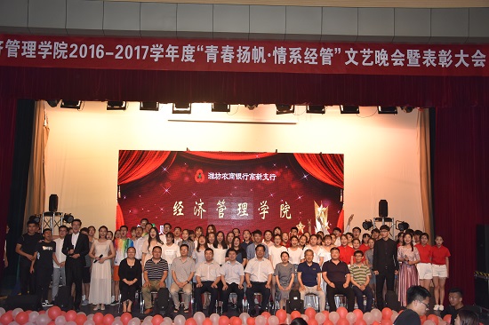 过去的一年里,经济管理学院紧紧围绕“党要管党、全面从严治党”的指导思想,积极开展全党“两学一做”和全团“一学一做”的教育实践活动,各项工作的开展都取得了显著的成效。为表彰先进,树立典型,2017年6月11日晚7时整,经济管理学院于图书馆报告厅举行了“青春扬帆,情系经管”文艺晚会暨表彰大会。出席本次晚会的领导嘉宾有经济管理学院院长刘鹏、经济管理学院党总支副书记王海梅、潍坊农商银行高新支行行长尹波、潍坊农商银行金马支行行长姜磊。