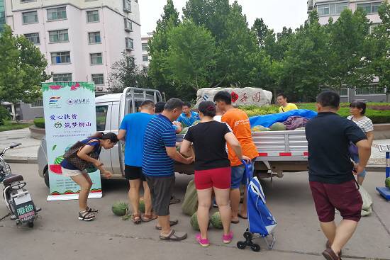 一场大雨令柳山社区的有机西瓜损失惨重,正在临朐县柳山社区开展暑期社会实践支教活动的物电学院“圆梦教育”服务队了解到这一情况,立刻兵分两路,一路帮农户抢收西瓜,装车发货。一路联系在校的老师和同学,组织微信认购,在潍坊学院展开了一场“爱心扶贫,筑梦柳山‘三下乡•千村行动’大学生暑期社会实践助力扶贫爱心义卖”的活动。下午3时,新摘的西瓜送到潍坊学院,老师们闻讯而来,你一袋、我一袋,纷纷为农户脱贫增收奉献出自己的一片爱心。