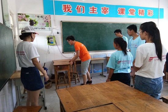 队员们在下午四时到达了目的地——临朐县蒋峪镇海尔希望小学。海尔希望小学的李丽主任及相关老师早早地为队员们分配好了住宿教室和做饭的锅碗瓢盆,总队长许泽霖与老师进行了一番沟通交流后,给大家开了一个简短的会议。他首先简单的介绍了本次志愿活动的主题以及每位队员所需要负责的任务;其次重点指出了在支教过程中应该对孩子们使用的教育方式和教育方法,强调选择的教课内容应积极向上,处处体现社会的正能量,教学手段应尽量把握住小学生的心理特点和思维方式;最后他对大家说:“既来之,则安之”,虽然学校条件不像家里一样好,但是这份志愿服务的经历是任何优越条件所无法比拟的。