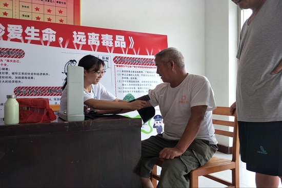 服务现场还未彻底布置好,就已经来了很多村里的老人,他们拿着马扎,在烈日下缓缓走进村委会。他们的额头布满汗珠,手上拿着汗巾不停地擦拭着,看到他们到来,志愿者们忙放下手中的活去搀扶。