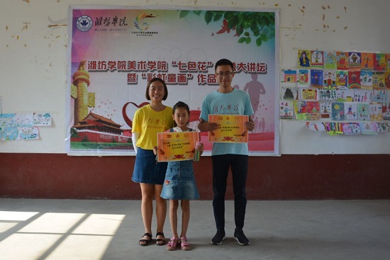 7月20日上午八点,潍坊学院美术学院大学生志愿服务队在临朐县寺头镇石家河村,开展了“七色花”公益大讲坛暨“彩虹童画”作品展。