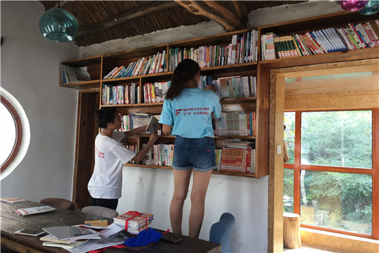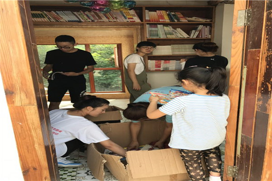 下午的任务艰巨又忙碌,图书被寄存到了村委会议室,志愿者们需要将这些图书全数挪放到牛寨书屋。志愿者们在会议室将图书认认真真的分类,再将每一类图书分别装置到纸箱里搬运到书屋去,烈日当空,志愿者们合力搬运,因为劳累,从村委到书屋的距离仿佛格外漫长,汗水在阳光下的照耀下闪着晶莹的光,但那是幸福的光,身体累,心里却是甜甜的。将图书全数搬到书屋后,志愿者们将这些图书整齐摆放到书架之上,丝毫不敢马虎,因为这些沉甸甸的书是对孩子们沉甸甸的爱,希望他们每次踏足这间书屋,心里会感到温暖,而这便是对暖阳服务队的志愿者们最大的满足。
