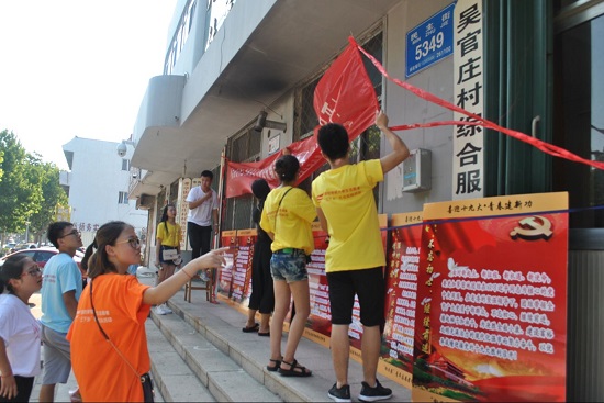 2017年7月26日一大早,在“向日葵”青年志愿服务队的带领下,数名学生骨干组成理论普及宣讲团,走进潍坊市寒亭区吴官庄村。一到村委会门口,队员们就麻利的将宣传看板摆放好,拉起条幅。7月的早晨,天气非常闷热,队员们在宣讲准备过程中出了一身的汗,但队员们却始终保持着高昂的精神状态。村委会也为队员们提供了一定便利,村主任恳切地请队员们到村委办公室歇息,“热了没有?渴了没有?村里给你们准备了水,大热天的,赶紧进来歇一歇……”一声声质朴的话语,让参加实践的宣讲队员们感动不已。