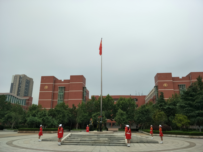7时10分,升旗仪式正式开始。庄严的义勇军进行曲奏响,英姿飒爽的国旗队迈着铿锵有力的步伐,护送国旗走向升旗台,抛旗手奋臂将国旗展开。国旗在慷慨激昂的节奏中缓缓上升,迎风飘扬,一抹鲜艳的红色绽放在碧蓝的天空中。全体师生庄严肃穆,注视着鲜艳的五星红旗。嘹亮的歌声、鲜艳的国旗,在每一颗年轻的心中再次激起了对伟大祖国的热爱,以及对美好未来的憧憬和希冀。