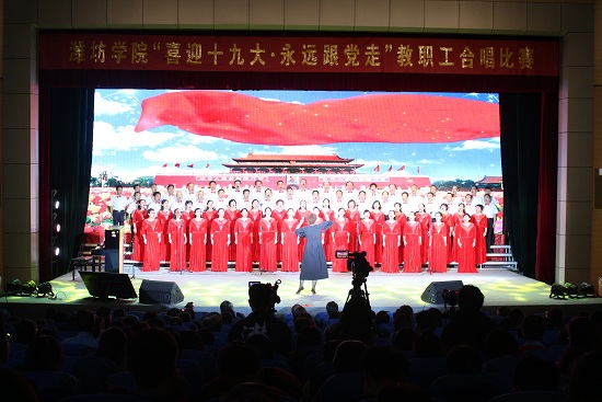全体教职工以嘹亮的唱声为迎接十九大的胜利召开献上赞歌,致敬伟大的祖国,礼赞伟大的党。展现了苦干实干、忠诚担当、奋发有为的精神风貌,唱响为实现“中国梦”而努力奋斗的时代主旋律,为喜迎十九大,共绘潍院美好明天表达了坚定的决心。
