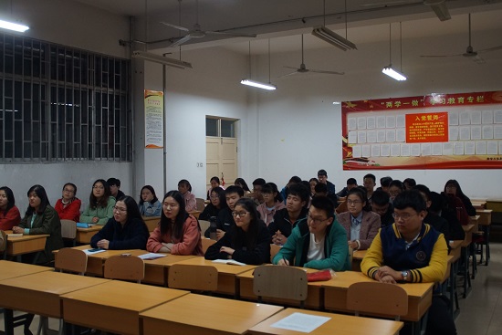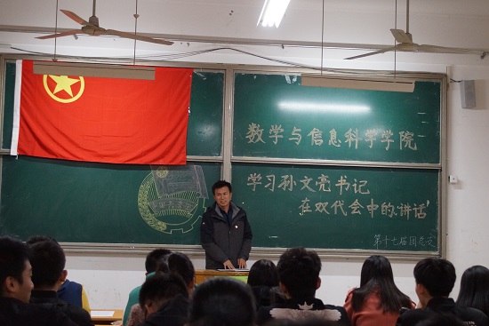 为使各团干部明确自己作为团干部的责任和义务,更好的深入学习党的十九大精神,数字与信息科学学院积极响应学校号召,于2017年11月1日在人合楼8119教室举办了孙文亮书记在双代会讲话的学习大会。参加此次大会的有数学与信息科学学院团总支副书记王鑫莉老师,第十七届团总支委员、团总支全体成员。