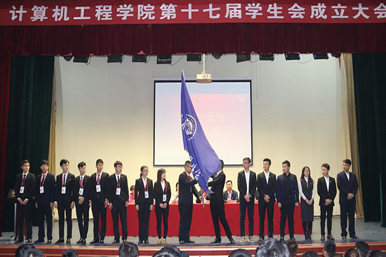在高连宏主任的主持下,会议进行第一项,全体成员起立奏唱国歌。在恢弘大气的国歌声中,站立的四百余名师生,经历了一次心灵的洗礼。会议第二项,第十六届学生会主席于晓康发表工作总结,总结了一年来学生会工作的点点滴滴和取得的优异成绩。会议第三项,团总支副书记肖甲波宣读第十七届学生会成员名单。会议第四项,第十七届学生会主席张殿鑫发表就职演讲,对学生会未来的工作进行了规划和畅想。他表示:新一届学生会将在院党总支领导和团总支指导下,本着“全心全意为同学服务”的宗旨,组织带领本届学生会为计算机工程学院的发展增添一股新生的力量。会议第五项,第十七届学生会部长代表高萌同学发言,展现出新一届部长们满满的干劲,蓬勃的朝气。会议第六项,新老主席团进行会旗交接仪式,于晓康展示会旗后交由张殿鑫,此刻,交到新一届学生会手中的不仅仅是一面会旗,更是一份使命。会议第七项,张殿鑫带领第十七届学生会成员进行庄严的宣誓。会议第八项,计算机工程学院领导老师为第十七届学生会主席团、部长级成员颁发聘书。