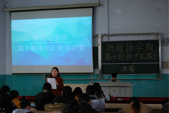为了加强外国语学院文化建设,创建学习型外院,全面提升学生综合素质,拓宽视野,外国语学院团总支学生会学习与科技创新中心于11月23号两点半在外国语学院3101教室举办了第十期读书汇报会决赛。此次比赛的评委为外国语学院第十三届团总支学生会主席张欣、副主席王晓洁,第十四届团总支学生会主席魏丽华,参赛选手为来自16、17级的各个专业的同学。