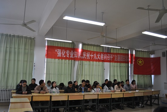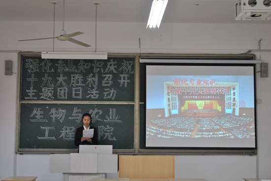 为庆祝十九大的胜利召开,不忘初心、进一步坚定在中国共产党的领导下走中国特色社会主义道路,做一名听党话、跟党走的合格的共青团员,11月23日下午两点,生物与农业工程学院团总支在八号教学楼8516教室特别举办了一次“强化专业知识,做合格共青员”的主题团日活动。