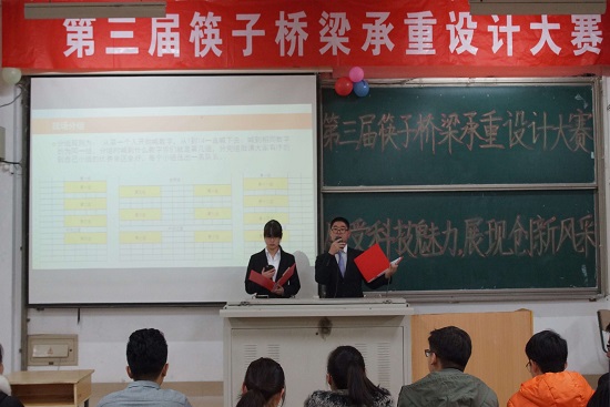 为保证此次比赛的公平公正性,在比赛正式开场前,对大一大二的全体参赛选手进行了现场随机分组,并选出队长,领取了比赛材料。随后,由主持人冯俊龙和冯婷婷介绍了比赛规则。比赛由“搭建模型”、“拍照承重”、“现场评分和微信投票”三个环节组成。在搭建模型环节中,需要选手们用30双筷子,一把小刀,一卷胶带组成了长度15厘米到80厘米,宽度高度各15厘米到30厘米的模型。50分钟后,一个个独特新颖精美的模型呈现在大家眼前,充分体现了同学们丰富的想象力和合作创新能力。紧接着,进入了第二环节,对每一组团队和作品进行拍照,并记录120秒内承载课本的数量后,由主持人现场宣布结果,赢得在场人员的阵阵惊叹。小小筷子组成的模型可以承载着几十本课本的数量,其中第六组的作品可以承重49本书,第十组的作品高度只有15.5厘米,却承重了42本书,展现着思考和创新的魅力。最后由学生会的主席团组成的评委们进行打分。除此之外,还要经过微信投票环节后,进行总评选。本次比赛设有集体奖,将会评出一等奖一名,二等奖二名,三等奖三名。