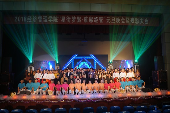 晚七点,晚会正式开始。威武霸气的舞狮及青春活力的开场舞蹈使晚会现场逐渐升温,观众们的热情被充分调动起来。接下来的歌曲串烧和异域舞蹈为观众们带来了一场视听盛宴,使观众们深深陶醉在精彩的节目中。此次晚会设有抽奖活动,一次次的抽奖使现场气氛愈加高涨。抽奖结束后,颁奖仪式开始进行,由各位领导老师向优秀学子们颁发证书,以表彰他们为经济管理学院做出的卓越贡献。颁奖结束后,节目继续进行,一首首美妙动听的歌曲,一段段帅气劲爆的舞蹈,一曲曲悠扬婉转的乐曲使现场气氛更加热烈。小品演员和相声演员的精彩表演引得全场观众笑声不断,舞台剧《初心依旧》,讲述了抗战期间爱国的热血青年勇于献身国家的,为争取民族独立国家富强而做出的伟大贡献的故事,展现了中华儿女不忘初心的爱国热情,使现场观众们情绪激昂,深受感动。紧接着经管学院的部长们带来的部长级舞蹈《BOOM》瞬间引爆全场,将现场气氛推向了高潮。伴随着结束曲《最初的梦想》的结束,全体演员与领导老师们集体上台合影留念,此次元旦晚会暨表彰大会圆满落下帷幕。