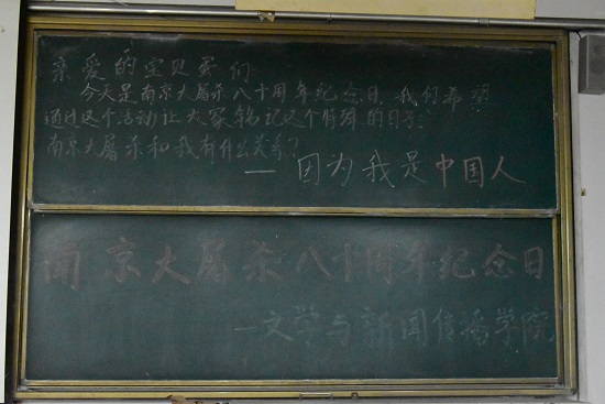 活动开始前,负责人提前在黑板上写好粉笔字“昭昭前事,惕惕后人,永矢弗谖,祈愿和平”。观影同学们一进教室就自觉坐好,没有吵闹没有嬉笑,他们神情严肃认真,静静等待六点三十分的影片。六点三十分该次观影活动准时开始,同学们没有一人说话,认认真真的看着投影上的画面,当看到那血腥的画面时大家都不自觉的屏息,整个教室只有画面上的声音。观看到七点整,负责人打开灯并且暂停影片,同学们起立,集体默哀一分钟,追忆历史,缅怀先烈。每个人微微低头、闭好双眼,愿死者安详,天堂再无杀戮。