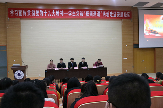 12月14日下午,潍坊学院学习宣传十九大精神学生骨干宣讲团走进安顺校区报告厅。宣讲活动由特教幼教师范学院学生工作办公室沈杰主任、我院学生工作办公室陈主任主持,安顺校区全体党员、入党积极分子、班干部等参加了报告会。