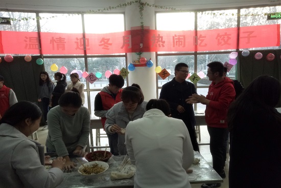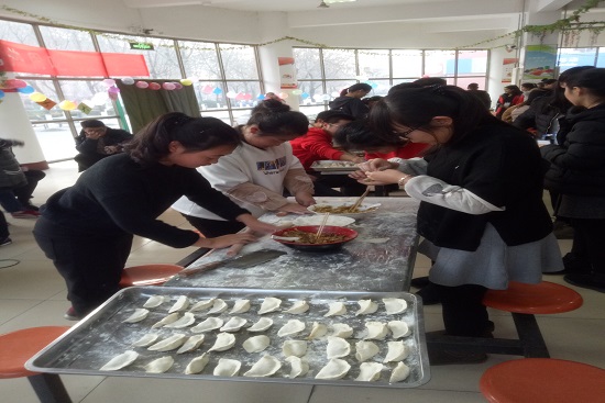 下午四点多,还没到饭点,餐厅一楼就坐满了十几桌满含期待的学生。一个个精致的饺子包好了,更有人别致地用饺子摆出了“心”的造型,引来不少赞叹。起锅了,香味飘来,老师、同学们、食堂工作人员围坐在一起吃起来。虽然有些饺子“卖相”不佳,但此时品着自己的手工却觉鲜美异常,一口一个吞。