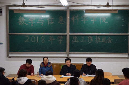 为了谋划好新年度工作,推进各项筹备工作的进行,数学与信息科学学院于3月10日在人合楼8119教室举行学生会工作推进会。数学学院党总支副书记郑栋鹏,学生工作处主任王秋霞,团总支副书记王鑫莉及辅导员韩军民,学生会主席团及各部门部长,团总支委员,2015级、2016级、2017级各班班长和团支书参加会议。