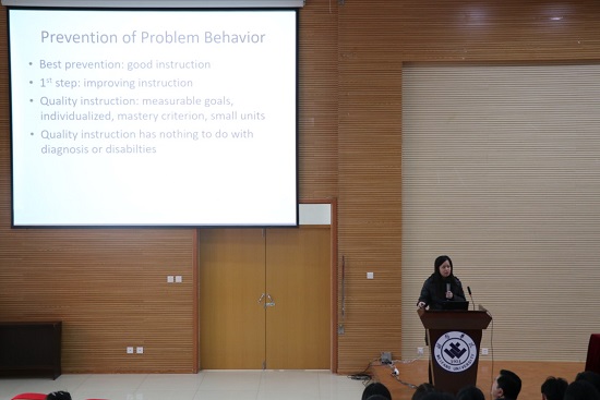 报告会开始之前,特殊教育专业刘慧丽老师简单为大家介绍了本次报告会的主题:问题行为儿童的功能分析处理及预防措施。报告会开始之后,蔡教授首先表达了自己来到齐鲁大地的激动心情,赞美了特教幼教师范学院学生积极的学习心态。报告会上,蔡教授为大家详细解释了管理问题行为的含义,阐述了功能性行为评估的重要性,为大家讲解了叙述性ABC录制、见算法等特殊教育专业名词的含义,蔡教授的报告深入浅出,逻辑严密,令台下的同学受益匪浅。