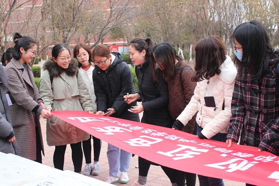 昨日的天气还阳光明媚、春风送暖,今日却北风呼啸,寒气扑鼻,双手丝毫没有从口袋里拿出来的勇气。但就在这样寒冷的天气里,同学们纷纷在红色的横幅上签下了自己的名字。