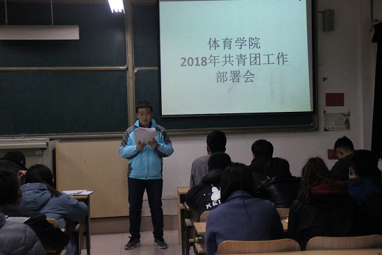 2018年3月15日下午18时,潍坊学院体育学院团总支学生会在体育学院T110教室召开了2018年共青团工作部署会议。本次会议由团总支书记卢永波老师主持,参加此次会议的人员为体育学院主席团成员,学生会各部门部长以及体育学院2015级、2016级、2017级团支部书记。