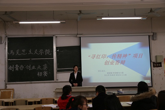为深入贯彻落实习近平总书记系列重要讲话精神,培养学生创新精神、创业意识和实践能力,3月22日马克思主义学院在齐贤楼2501教室举行了“创青春”创业大赛的初赛。本次大赛由黄素文同学主持,马克思主义学院教师徐建文博士、学生工作办公室主任赵静老师、团总支副书记崔秀玲老师担任本次大赛的评委老师。