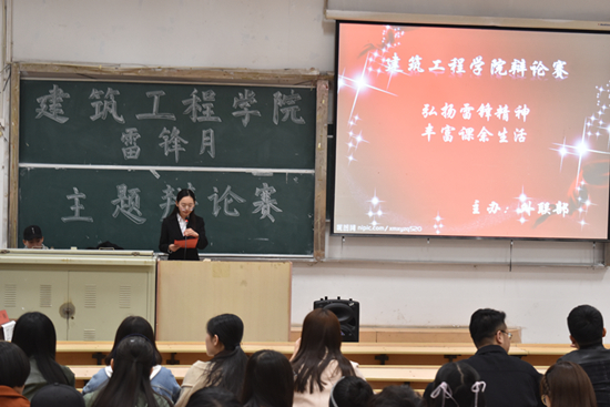 为弘扬雷锋精神,丰富大学生的课余生活,3月23日晚上7点,建筑工程学院在致远楼6114教室展开了一场精彩的辩论赛。本次比赛由建工学院外联部主办,该院学生会部长级以上成员作为评委出席。