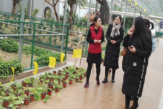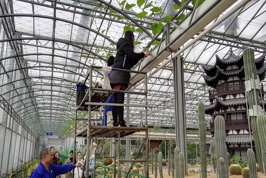 随后小组成员又来到充满异国风情的三、四号展厅,馆内既有适宜干旱环境生存的各类仙人掌,也有适宜湿热环境的香蕉等多种具有不同地域风貌特色的植物。实验员介绍说馆内统一采用了水肥一体化系统,实施精准施肥与灌溉,合理解决了农业灌溉中存在的水资源浪费、施肥不均等问题,实现节水节肥、改良土壤、减少作物发病的目的,从而大大提高了农作物的品质和产量。此外,成员们还了解到中国古代杰出农学家贾思勰是寿光的文化名人,他在《齐民要术》中提出了很多的农业生产经验对后世影响深远,但现代温室大棚技术打破了其中的农作物要因时而种、因地制宜的说法,证明了科学技术必须吐故纳新、与时俱进,从创新中得到发展。