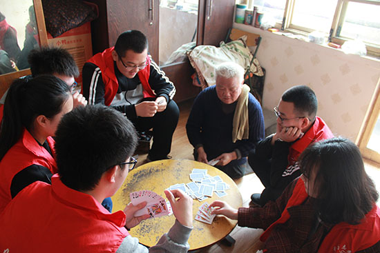 与此同时,另一路志愿者来到宋家友宋大爷的家中,,志愿者首先对宋大爷近期的生活表示了亲切的关怀,宋大爷洪亮的笑声。让志愿者们感受到大爷心中的喜悦。宋大爷还邀请志愿者一起打扑克,他们围坐在圆桌旁开始了三人一组的对战,其他的志愿者则为宋大爷收拾房间,打扫卫生。宋大爷打扑克的同时还不忘同志愿者们聊天,屋内充满了欢声笑语。