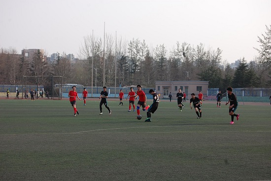 中场休息时间球员们围在一起讨论比赛形势和战术,队友们互相鼓舞打气,11个人的双手叠加在一起,口中呐喊着:“计算机,必胜!必胜!必胜!”。队员们带着熊熊的决心再次踏上球场。下半场比赛开始,我方球员继续保持高昂的斗志,不断向对方发起猛攻,虽多次射球,但在对方球员的防守下并未进球,激烈的拼抢极大地消耗了队员们的体力。当对方发起猛攻,我方球员紧密防守未让球过半场,就在此时,我方9号球员李梦泽过人推射,再进一球,瞬间场上掌声四起。随后两支队伍各找机会突破防线,但在我方门将的阻拦下,对手的进攻失败。而对方的门将也多次化解了危机,实力也不容小觑。场上的每个球员都全力以赴,努力奋战到最后一刻,最终比赛以4:0结束。双方拼尽了全力,不留遗憾。