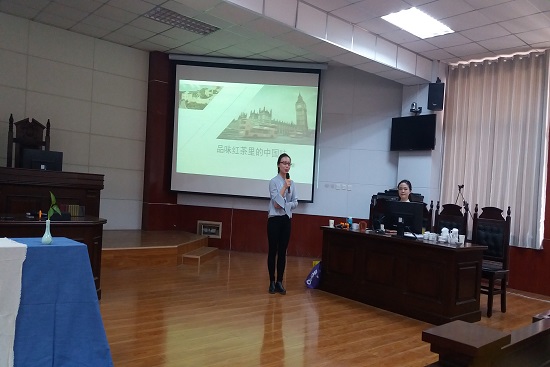 活动开场,正山茶业的专业茶艺师就为大家带来了一场精彩的茶艺表演。旋律优美的古乐声中,茶艺师向大家展示了功夫茶的十八道茶艺程序,她通过各种茶叶冲泡技艺的形象演示,科学地、艺术地、生活化地展示茶叶的泡饮过程,使同学们在精心营造的优雅环境氛围中,得到美的享受和情操的熏陶。她的表演动作娴熟、优美,得到了同学们的热烈掌声。接下来,正山茶业的主讲董老师从红茶的分类、起源、传承等方面,向同学们详细介绍了茶叶知识。董老师讲座过程中频频与学生互动交流,极大的提高了学生学习茶文化的兴趣。最后,董老师向大家展示了几个红茶的识别及品鉴,冲泡茶水让学生自己品尝,实际操作,在实践中感悟茶文化。本次活动得到了参会同学们的热情响应,同学们积极参加品茶实践,品尝 “红茶里的中国味”。