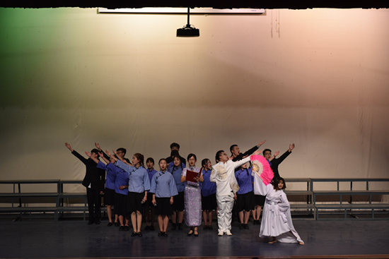 赛前,建工学院师生充分利用课余时间排练节目,付出的背后收获了友谊,拾取了快乐。伴随着悦耳的背景音乐,建工学院的学生自信满满,登上舞台。他们身着民国学生装,高喊着“天地苍苍,乾坤茫茫,中华少年,顶天立地当自强。”一时将大家的思绪带到了那个年代。他们与王春娥老师配合默契,情绪饱满、气势高涨,极富感染力,浓浓的师生情在比赛中洋溢着。节目中穿插的古典舞柔中带刚,拂袖间让人思绪蔓延;武术表演则令人为之振奋,舞剑、打拳无一不展现着建工健儿的英姿;期间的歌曲表演,令人耳目一新,现场掌声阵阵。最后一句“壮哉我中国少年,与国无疆!”掷地有声,慷慨激昂。台下观众尽情的享受着这场精彩的视听盛宴。