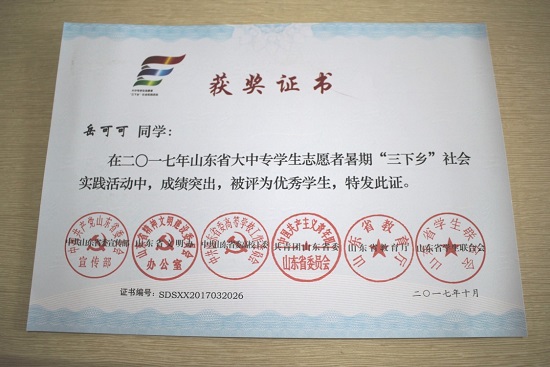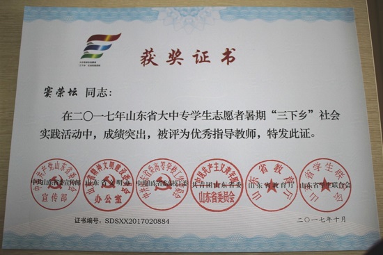 鲁迅先生曾言:“伟大的成绩和辛勤劳动是成正比例的,有一分劳动就有一分收获,日积月累,从少到多,奇迹就可以创造出来”。人生路上,每一次的付出都会得到相应的回报,在2017年暑期的"三下乡"活动中,特教幼教师范学院团总支书记窦荣坛获得"2017年山东省大中专学生志愿者暑期'三下乡'社会实践活动优秀指导教师"称号,初阳教育服务团队荣获"2017年山东省大中专学生志愿者暑期'三下乡'社会实践活动优秀服务队"称号,2016级学前教育专业岳可可同学荣获"2017年山东省大中专学生志愿者暑期'三下乡'社会实践活动优秀学生"称号,2015级特殊教育专业徐砚同学荣获"2017年山东省大学生'三下乡·千村活动'共青团助力扶贫专项活动优秀学生"称号。