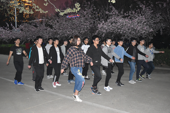 为了迎接即将到来的春季运动会,建筑工程学院学生会工作人员积极组织学生训练方队。4月21日晚,建工学院方队在樱花东路进行花扇舞的训练。