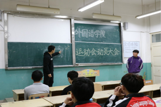 为了迎接潍坊学院运动会,做好宣传部署的后续工作,外国语学院于4月22日在3233教室举办了运动会动员大会,参加此次会议的是外院学生会副级部及以上成员。