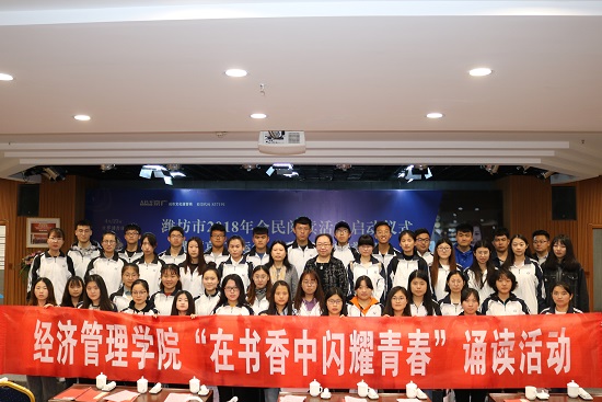 在第23个“世界读书日”来临之际,潍坊市2018年全民阅读活动启动仪式暨“京广读运会 · 书香润德 文化鸢都 ”潍坊千人诵读活动4月22日上午在潍州大讲堂盛大开幕。为了深入开展“博学的青春最美丽”主题教育活动,在学校营造尚学博学笃学的氛围,培养同学们爱读书的习惯,潍坊学院经济管理学院作为协办方参与了这次读书活动。