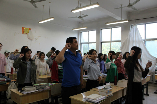 活动伊始,主持人向大家提出问题:“今年是纪念五四运动99周年,我们每个人都无法忘记那具有划时代意义的五四运动,那么何为五四精神?”大家对此看法不一,讨论声不绝于耳。有的人认为是爱国主义,有的人认为是民主与科学,更有的人认为是解放思想、不断创新。当提及到入团誓词与团歌时,班内同学达成一致共同唱起团歌。而后外国语学院团支部书记卢术强老师上台进行五四精神演讲,表明对同学们强烈期望,希望他们能把五四精神与生活相结合,一同为祖国的繁荣昌盛努力奋斗。外国语学院2017级辅导员李岩老师更是鼓励团员青年继续发扬优秀品质,对未来的学习和工作都要有所规划,争做优秀的青年!最后,外国语学院法语专业2016级1班团支部学团员代表贾紫东表示到大家定当会担起时代重任,不负历史使命,勇往直前,实现自我人生价值,用火热的青春与辛勤的汗水,续写青春岁月的光辉业绩。