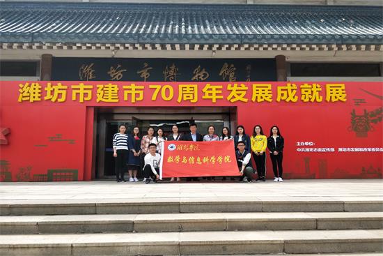 为了庆祝潍坊建市70周年,了解潍坊建市70周年的辉煌历程与伟大成功,数学与信息科学学院部分师生于5月12日参观了“潍坊建市70周年成就展”,本次活动由数学与信息科学学院学生工作办公室主任、学生党支部书记王秋霞老师与数学学院团总支副书记王鑫莉老师带队。