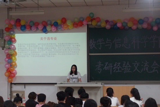 为增强同学们的考研热情,解答同学们关于考研的疑惑,2018年5月14日晚数学与信息科学学院在人合楼8122教室举办了考研经验交流会。