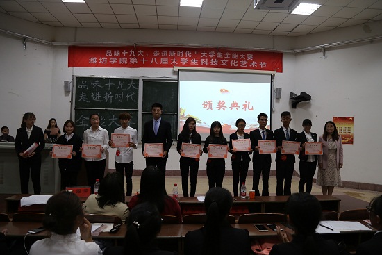 首先,阎旭东、张蕤两位主持人向大家介绍了各位评委老师,并宣布比赛开始。第一个环节是“学深悟透十九大,不忘初心再起航”征文朗诵环节,各学院参赛选手依序上台朗诵,通过优美精炼的语言赞颂党的丰功伟绩,抒发爱党爱国之情。来自北海国际学院(歌尔科技学院)的王佳豪用星光拟喻十九大精神,动人的语句畅述爱党情。“人生因梦想而精彩,世界因梦想而辉煌”外国语学院的同学从梦想出发,思绪万千尽化言语喷薄而出。马克思主义学院的王文倩同学以《心有猛虎,轻嗅蔷薇》为题,细谈“初心”,引人深思,十个学院均表现不俗。