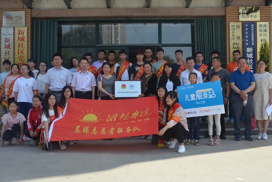 5月19日上午,化学化工与环境工程学院晨曦志愿者服务队社会实践基地签约揭牌仪式在潍城区壹乐园儿童服务站举行,共青团潍坊市委志愿者工作部邱君,潍城区文明办主任王春青,共青团潍城区委书记孙超,潍坊市志愿者协会副理事长、鸢都义工公益服务中心理事长、潍坊市领航社会工作事务所理事长孙志达,新城社区居委会副主任李俊华,化院党总支副书记孙玉凤、团总支副书记马永生与壹乐园的工作人员和晨曦志愿者服务队的志愿者们共同参加了本次活动。