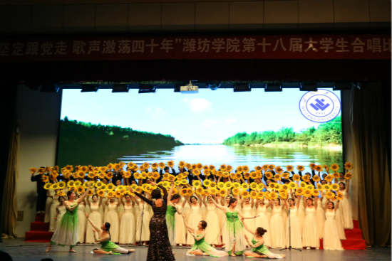 为深入贯彻落实习近平新时代中国特色社会主义思想、党的十九大精神和学校第三次党代会精神,隆重纪念改革开放40周年,同时响应潍坊学院第十八届大学生科技文化艺术节的号召,5月24日下午两点潍坊学院在图书馆报告厅举办了潍坊学院第十八届大学生合唱比赛,外国语学院作为代表队参加此次比赛。