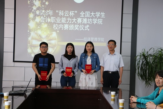 5月26日下午三点半,潍坊学院经济管理学院在致远楼409会议室成功地举行了“科云杯”会计职业能力大赛校内赛的颁奖仪式,莅临本次颁奖仪式的领导有经济管理学院党总支书记郎益伟,院长刘鹏,党总支副书记王海梅,副院长刘建波,学生工作办公室主任徐会全,团总支副书记于敏,会计教研室主任刘孝民以及经济管理学院老师黄雷、郎丰伟。在比赛中获奖的同学也参加了本次颁奖仪式