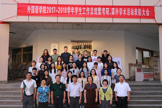六月十四号下午五点,外国语学院在至善楼院内举行了2017-2018学年学生工作总结暨考研、课外学术活动表彰大会。外国语学院党总支书记王健老师、外国语学院副院长韩泽亭老师、外国语学院副院长张继文老师、外国语学院党总支副书记刘希美老师,学工办主任马俊玲老师,团总支书记卢术强老师,辅导员李岩老师出席今天总结表彰大会。