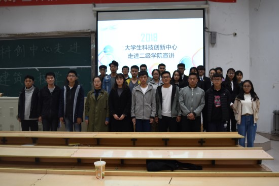 宣讲伴随着主持人开场的致词正式开始,首先一段科技短片带同学们走进了科技创新的精彩世界,让每个人都感受到生活中创新的魅力。宣讲团由潍坊学院科技创新中心组织策划部部长明浩、竞赛组织部部长李冬辉、项目管理部部长何召财、学术活动部部长王栋、新闻宣传部部长王子颖五位同学组成,他们依次上台,主要从“挑战杯”、“SRTP”、“创青春”等方面出发,结合PPT向同学们展示了最新的学术和顶尖科技成果,生动细致的讲解促进了大家对科创各平台的认知,增强了18级同学的创新意识与实践理念。五位同学还分别介绍他们的研究课题,帮助同学们了解科研项目,极大的激发了同学们对科技创新的热情。紧接着,科创中心主任徐其钊简要总结,他分析了建工学院在科创方面的成果,鼓励同学们把握机会,积极创新。最后,建工学院科创中心主任尹丽君对此次宣讲做总结性发言,科技引领发展,创新成就未来,尹丽君呼吁同学们努力做一名敢创新、爱创新的有为青年。宣讲在宣讲团成员与建工科创中心成员的合影留念下圆满结束。